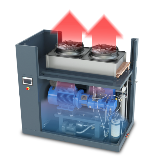 位于頂部的特殊設計低噪音軸流風扇將冷卻器、電機等部件產生的熱量強制排出機組,使空壓機內部始終在一個理想溫度下。特別形狀的扇葉,顯著降低排風噪音。